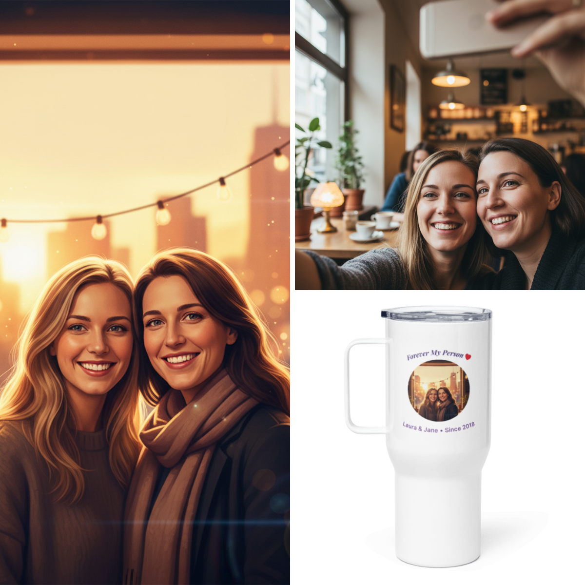 Turn your favorite selfie into a one-of-a-kind art tumbler — preview before printing.